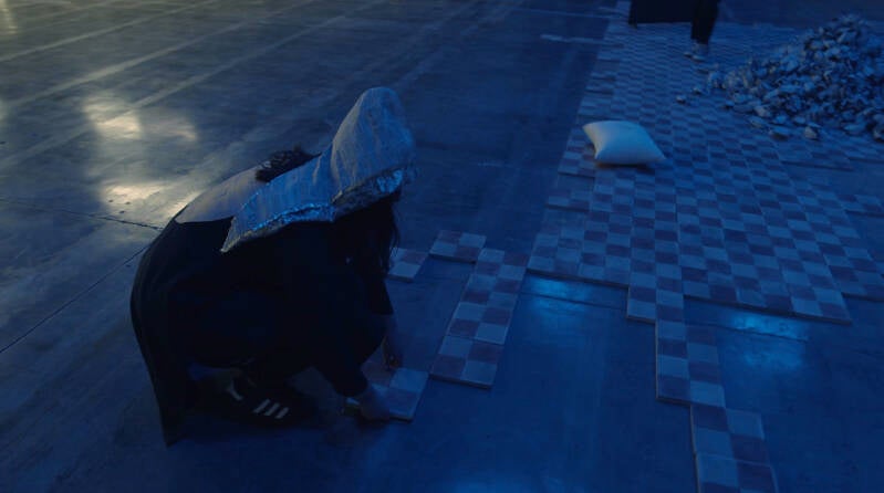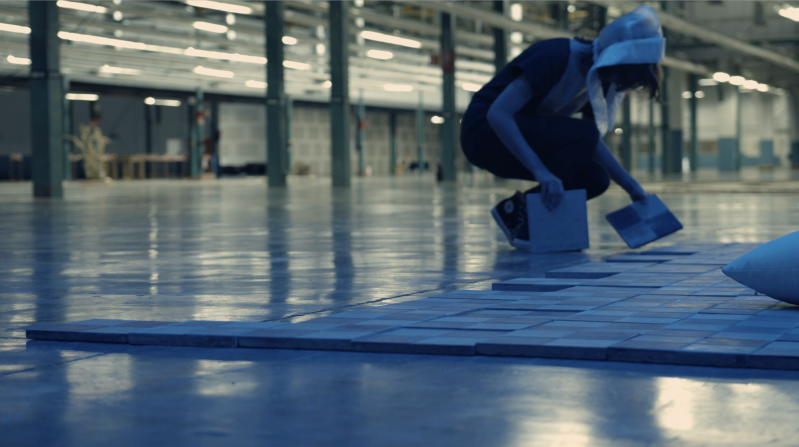 The performance takes place on this deterministic board of three-dimensional language. The two women who enter this system communicate through the elements that compose it. Reconfiguring its order and utility to create new relationships and meanings. Whispering both notions of productivity and unproductiveness of the female body as well as symbolic and physical labor.