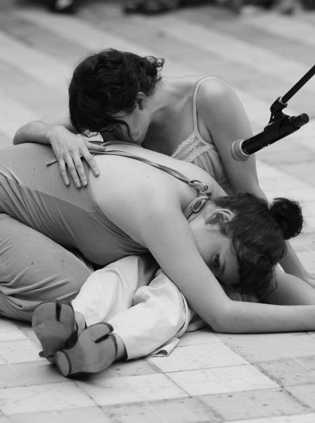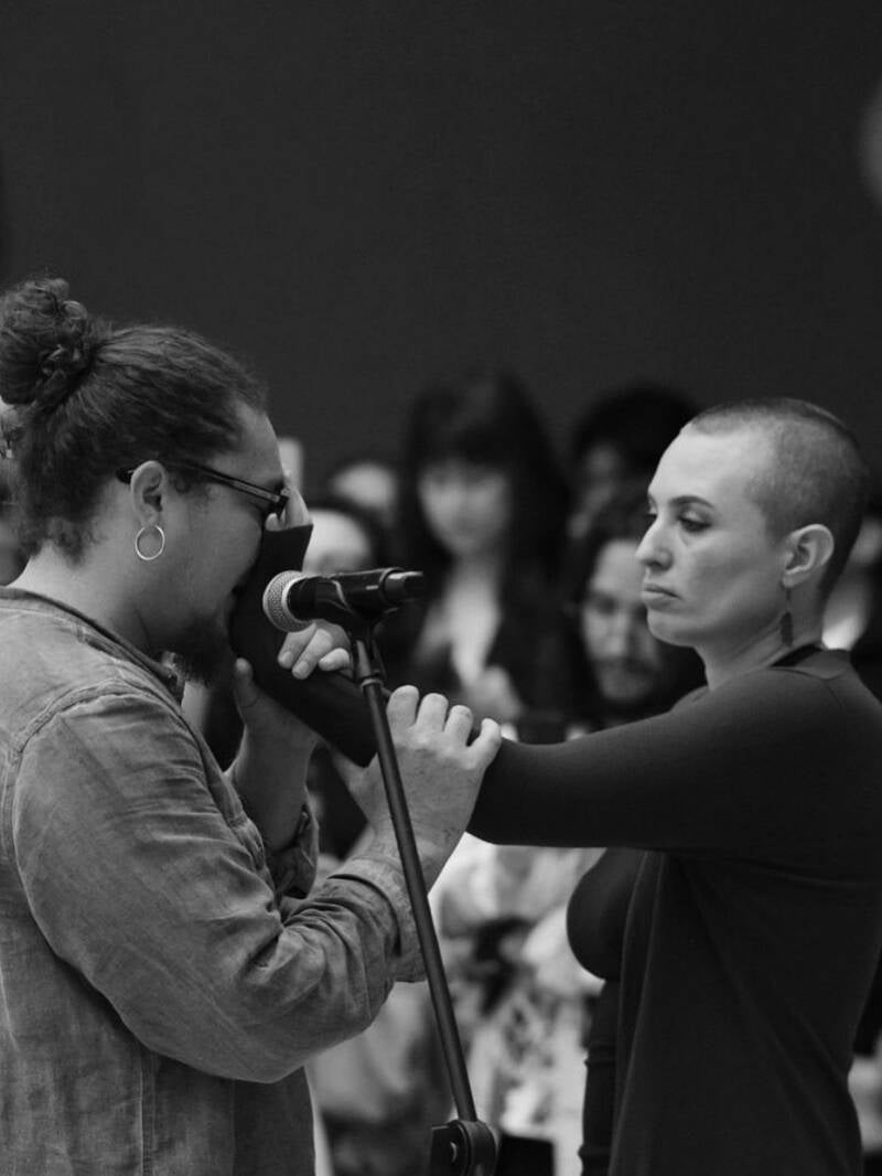 In Filter [Coral] a group organizes itself into pairs to project its voice into the other's interior and vice versa. Sound is an agreement and is executed with gentleness and mutual trust; intuitively, the organ is chosen, the part where to place the voice, and where to receive it. The songs sung are those that emerge from memory; the lyrics become indecipherable due to the compression of the voice sealed against the body, generating a muffled, deep, and melodic sound. Even though the filtered voices become hums and whispers, the songs are never the same and the tempos are not timed, they are easily merged with each other every time, creating harmonies between them, floating abstractly among all recognizable things. A song made of many songs.