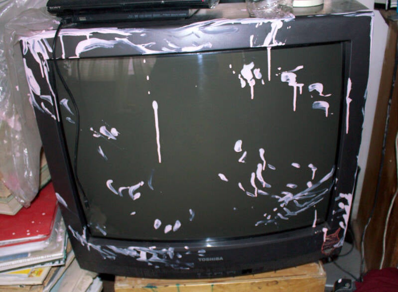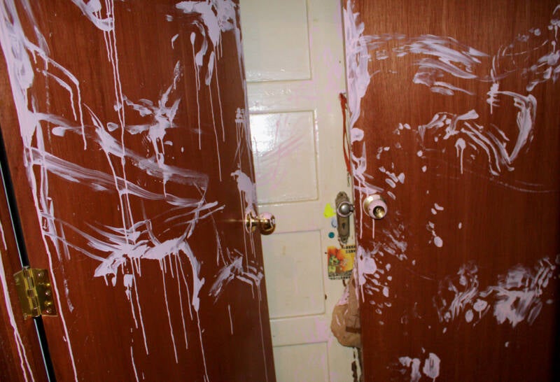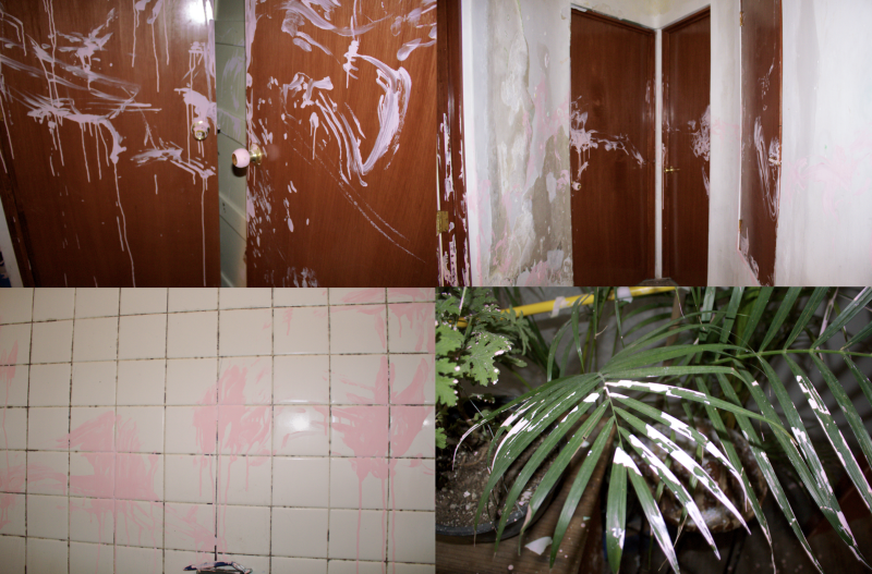 The painting was made blindfolded by the painter Héctor Rentería in Biquini Wax a house unknown to him, which functions also as an art space. The next day, I entered the space and I made a tour that was recorded on video of his paint marks. Then I erase all traces of paint from the house. The video of the painted house was projected on the clean house. A video on every floor of the house.
