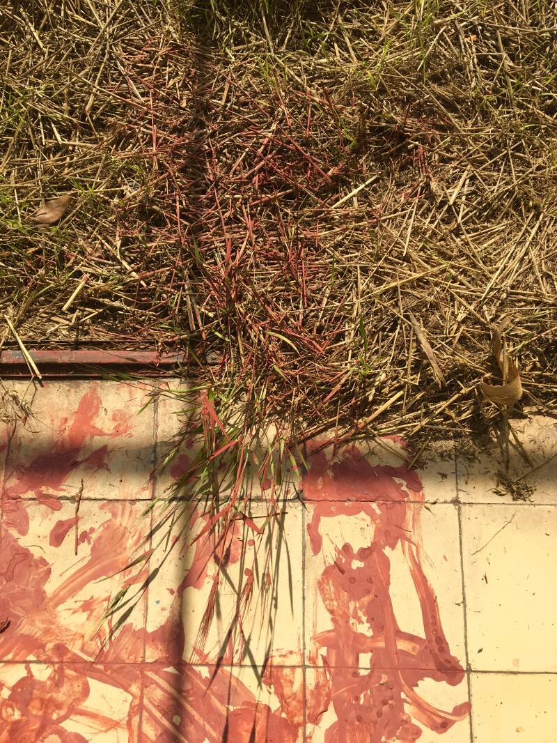 The painting was done at midnight in the dark, in an unoccupied house used as an art space. The place was unknown to both of us, of which we had only seen photographs of the color of the floor of the place. Each one with a can of paint, the opposite color to that of the floor, advanced along the ground blindfolded, recognizing and marking the surface and leaving traces of paint by touch. The next day at noon, we entered the space marked by the other to go through it and register it. Then one erased the marks of the other with water. The video of both tours was projected on the floor together and in parallel.