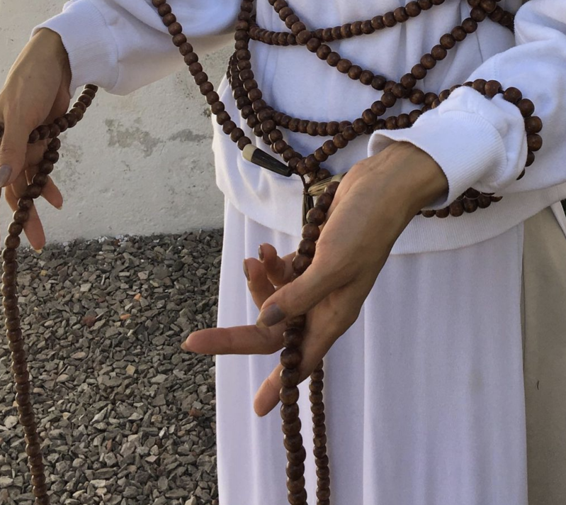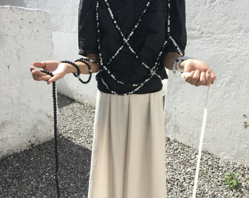 Rose quartz, moonstone, volcanic rock beads and and metallic thread, 2018